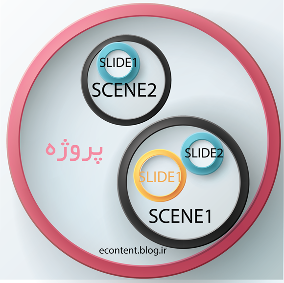 هر فایل تولید محتوا در Storyline یک پروژه نامیده می شود که هر پروژه شامل یک یا چند scene (صحنه) و هر Scene شامل یک یا چند اسلاید است.